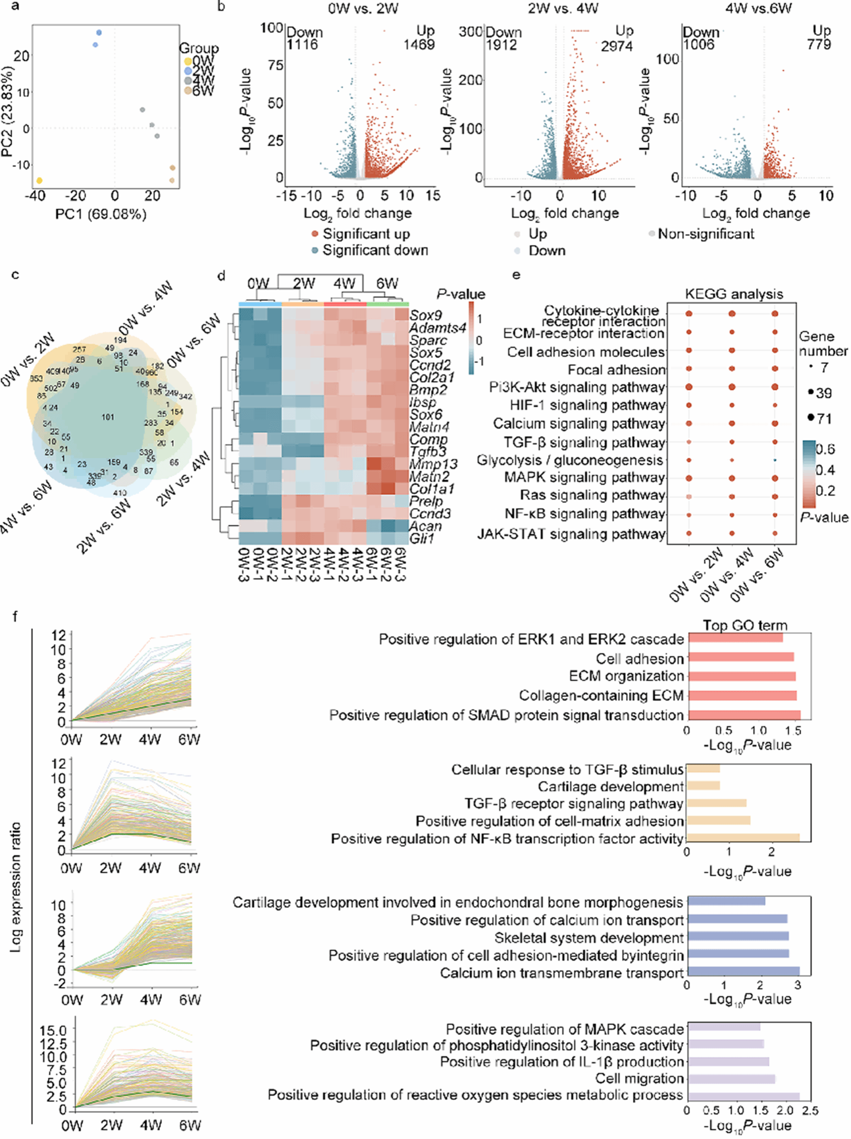 a. PCA(n=3);b. 火山图(0↔2W,2↔4W,4↔6W);c. 维恩图;d. 关键成软骨mRNA热图;e. KEGG富集;f. STEM分析。