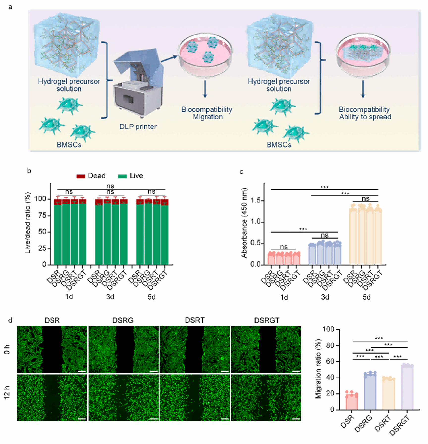 a. 设计示意;b. 1/3/5 d活/死染(n=3);c. CCK‑8增殖(n=6);d. 划痕‑定量与Transwell迁移;12 h DSRGT迁移率最高(55.09±1.08%)。