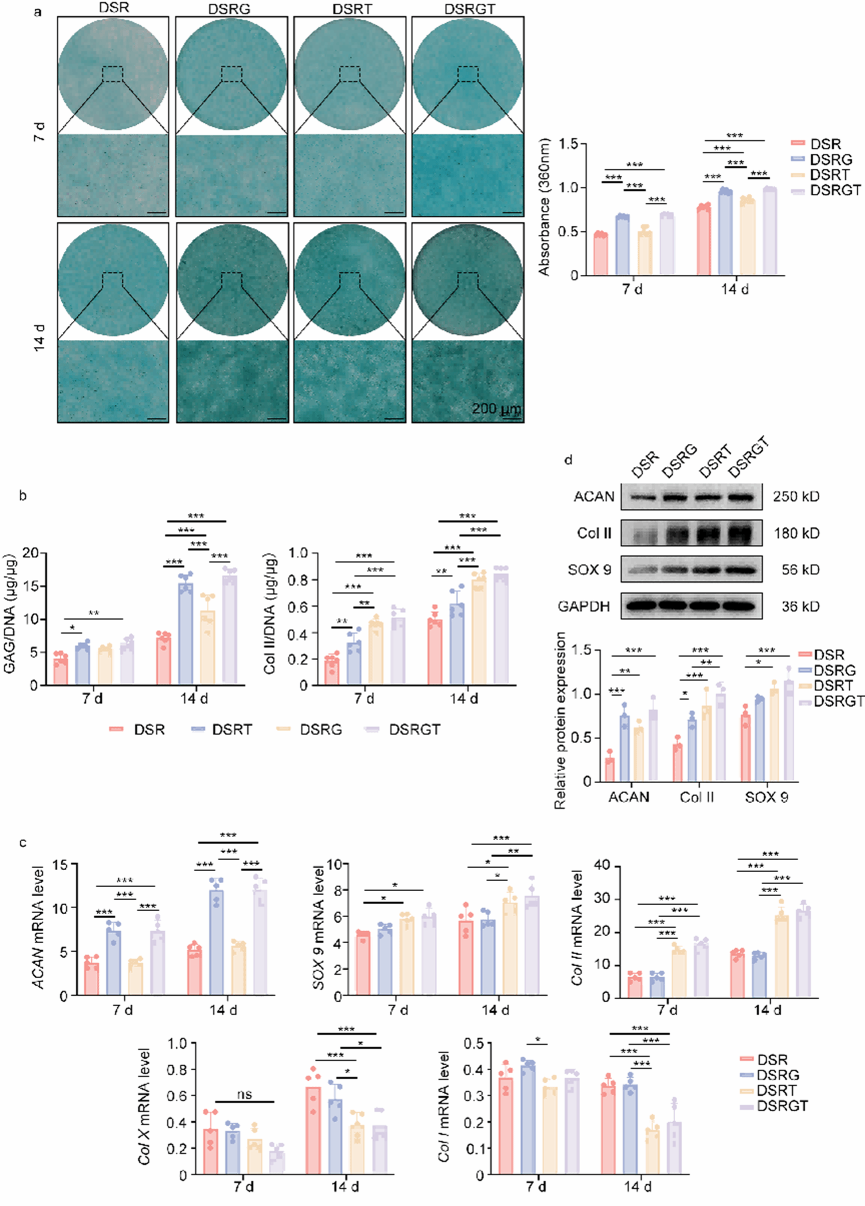 a. 7/14 d番红/Alcian blue及定量(n=6);b. GAG与Col II含量(n=6);c. qRT‑PCR(Col I/Col X/ACAN/Col II/SOX9;n=6);d. WB与定量(ACAN/Col II/SOX9;n=3)。DSRGT总体最优。