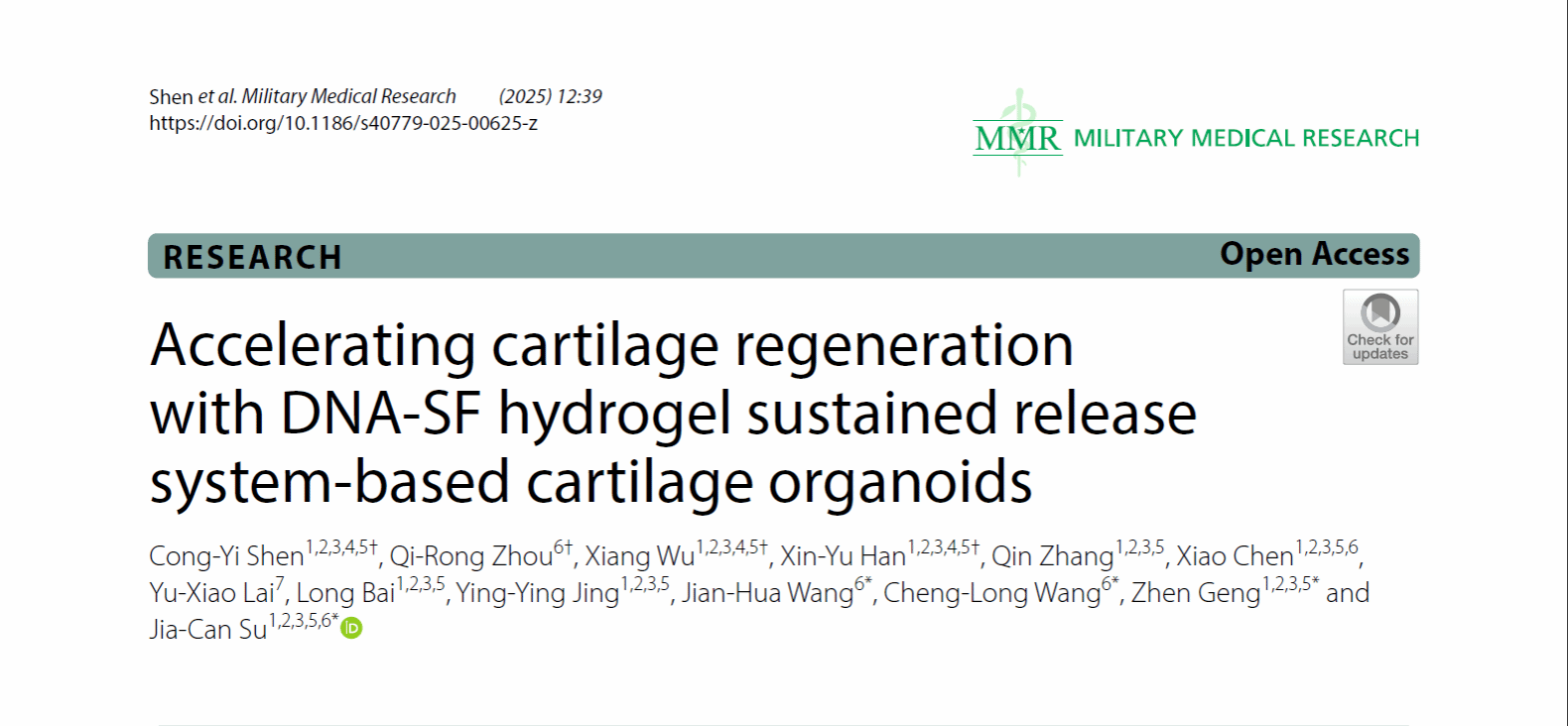 近期,上海大学转化医学研究院/上海交通大学医学院附属新华医院骨科苏佳灿教授团队在期刊 Military Medical Research 上发表综述究性文章:"Accelerating Cartilage Regeneration with DNA-SF Hydrogel Sustained Release System-Based Cartilage Organoids"。文章将“共价缓释 + 3D打印”整合进类器官工程,在4周内稳定塑造透明软骨表型并在8周内实现功能性修复。它把材料的长期供能与分化信号的时序调控打通,为长期培养的类器官移植提供了可标准化的材料-类器官协同路径。转录组-通路-蛋白多层证据链支撑MAPK为关键轴,具备向临床修复/药筛/疾病模型延展的潜力。上海大学转化医学研究院沈聪昳博士研究生、武翔博士研究生、韩欣雨硕士研究生、上海交通大学医学院附属新华医院周启荣主治医师为论文共同第一作者,上海大学转化医学研究院/上海交通大学医学院附属新华医院苏佳灿教授、上海大学转化医学研究院耿振副研究员、上海交通大学医学院附属新华医院王成龙副主任医师、王建华主任医师为论文共同通讯作者。