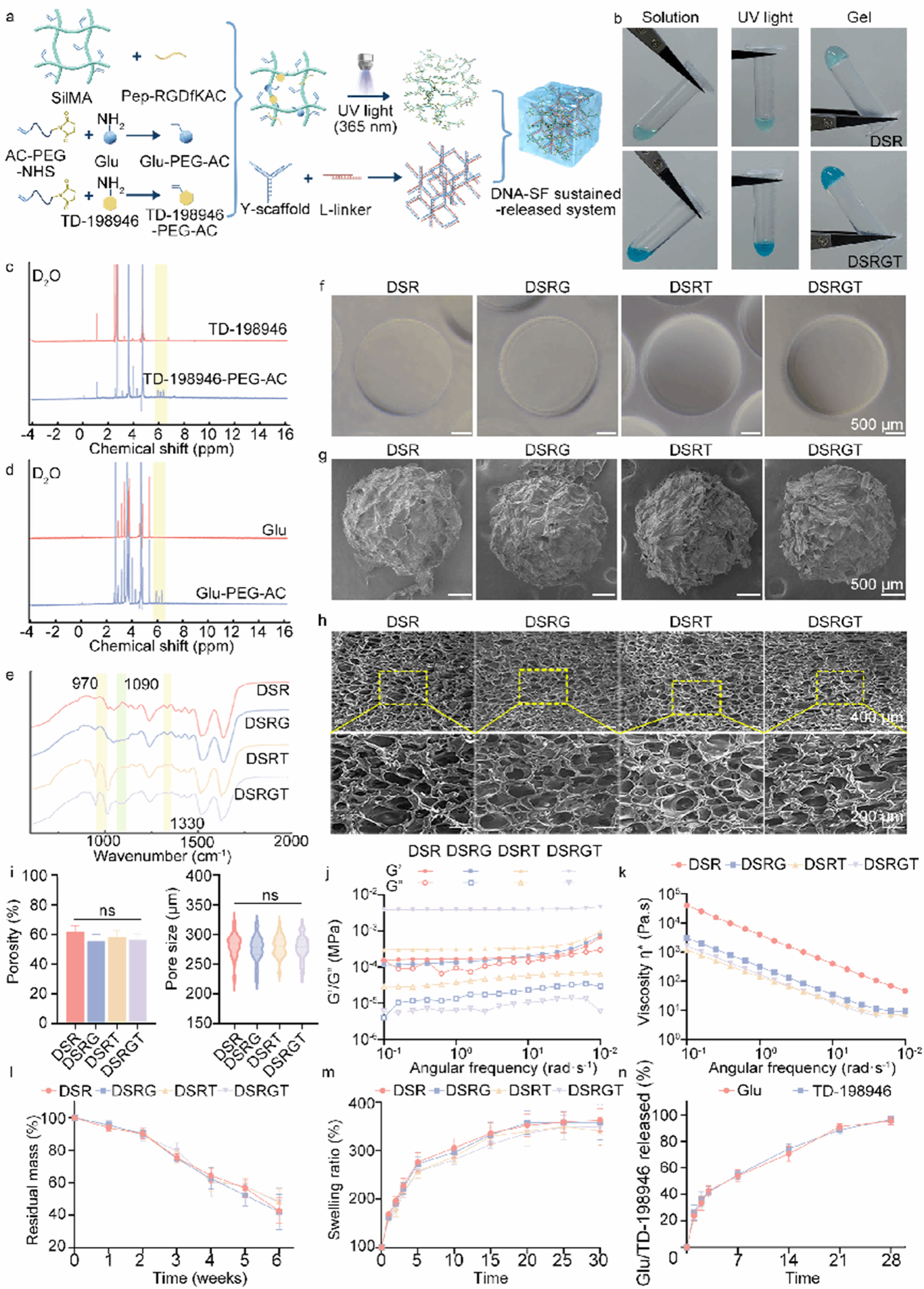 a. 合成路线与分子相互作用示意;b. 溶胶-凝胶转变;c–d. TD 198946 PEG AC与Glu PEG AC的¹H NMR(D₂O);e. DSR/DSRG/DSRT/DSRGT的FTIR;f. DLP打印球体的宏观图(标尺500 µm);g. 打印球体的FE SEM(500 µm);h. 本体水凝胶FE SEM;i. 孔隙率(n=6)与孔径分布(n=150);j. 储能/损耗模量频扫;k. 黏度 剪切速率曲线;l. 降解曲线(n=6);m. 吸胀比(n=6);n. Glu与TD 198946缓释曲线。