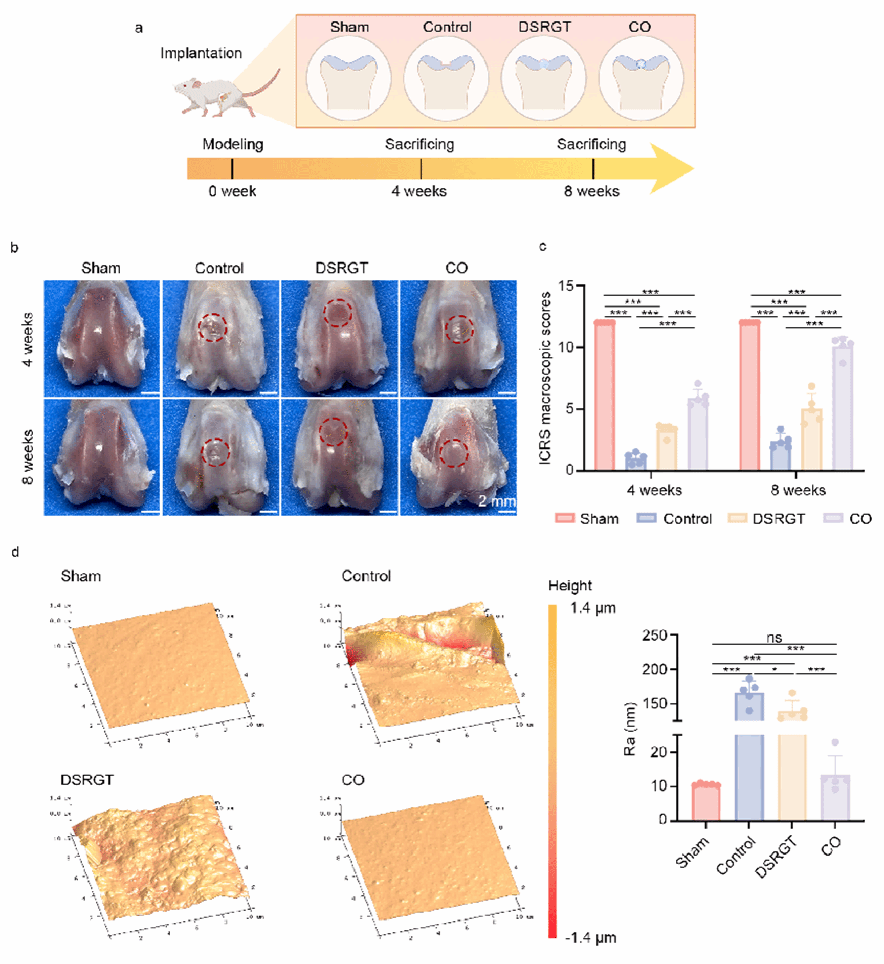 a. 分组/建模示意;b. 4/8周宏观;c. ICRS评分(n=5):CO组最高;d.AFM粗糙度(8周):CO接近Sham,优于对照与DSRGT。