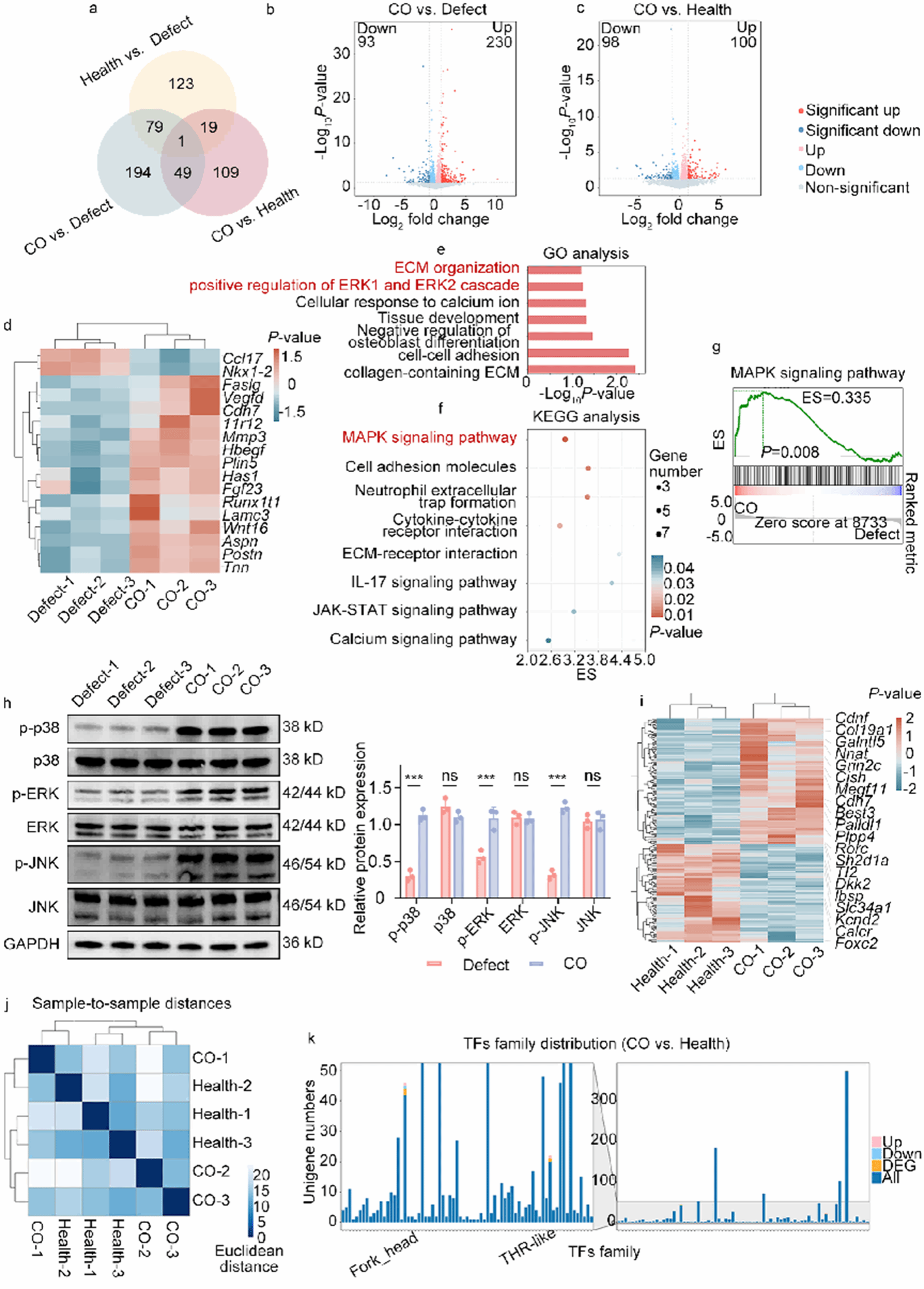 a. 维恩图;b-c. 火山图(Defect vs CO;CO vs Healthy);d. 再生关键基因热图(Defect vs CO);e. GO;f. KEGG;g. GSEA;h. WB验证(n=3,p p38/p ERK/p JNK↑);i-k CO与Healthy的聚类与TF家族分布。
