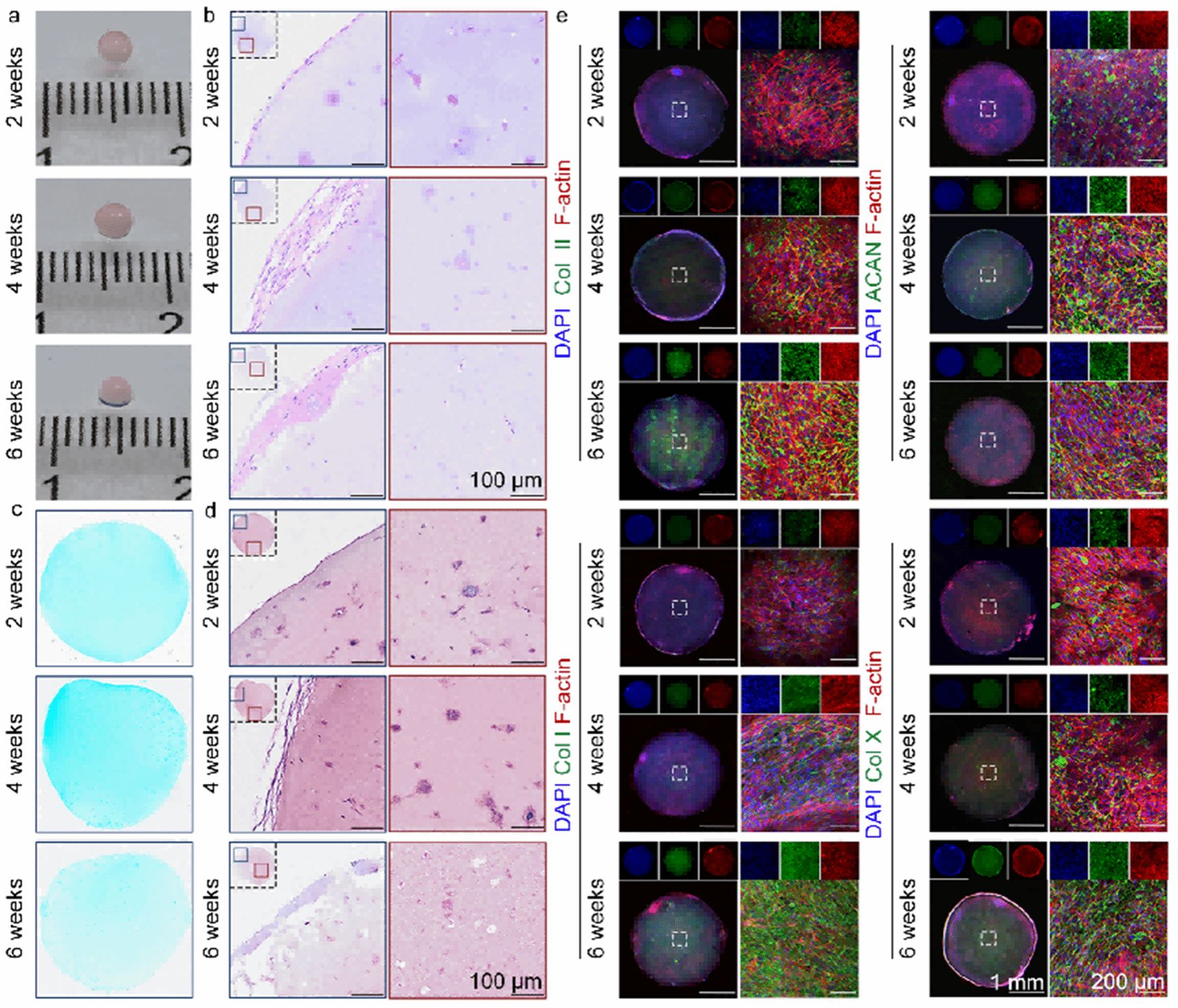 a. 宏观形态;.b HE;c. Alcian blue;d. SO/FG;e. IF(Col II、ACAN、Col I、Col X;n=6)。4周时GAG与ACAN最强,Col X较低。