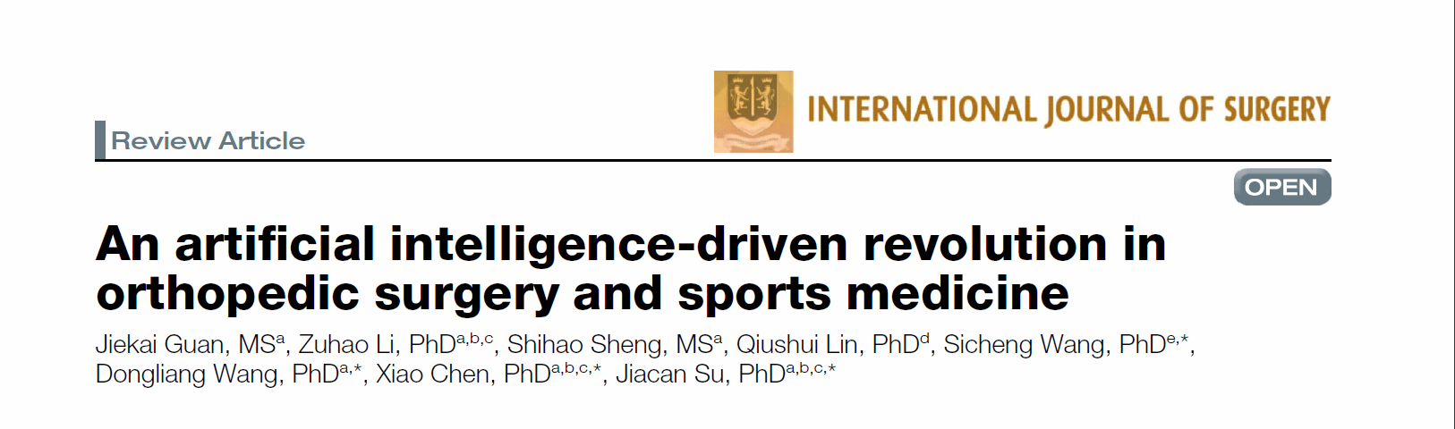 近期,上海大学转化医学研究院/上海交通大学医学院附属新华医院骨科苏佳灿教授团队在期刊 International Journal of Surgery 上发表综述究性文章:"An artificial intelligence-driven revolution inorthopedic surgery and sports medicine"。文章展现骨科AI正从单点读片走向“诊断—治疗—康复”全流程协同,但数据碎片化与跨人群偏倚仍是落地关键门槛。未来,5G远程、GOAI与VR/AR等融合有望推动骨科进入更高效、更个体化的智能时代。上海交通大学医学院附属新华医院管婕凯硕士研究生、盛世豪主治医师、上海大学转化医学研究院李祖浩博士后为论文共同第一作者,上海大学转化医学研究院/上海交通大学医学院附属新华医院苏佳灿教授、上海交通大学医学院附属新华医院陈晓副主任医师、王栋梁主任医师、上海中叶医院王思成主任医师为论文共同通讯作者。