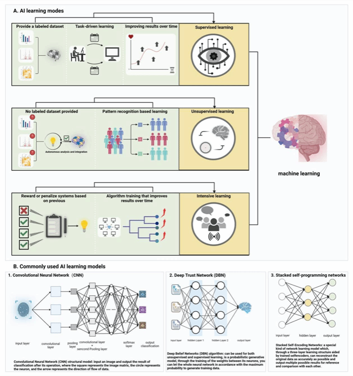 把AI学习范式与典型DL模型放在同一张图里,读者可以快速建立“模型能力边界”和“适用任务类型”的直觉。