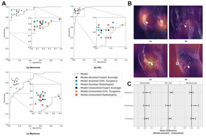 用ROC曲线与专家点位对照说明“AI不是替代医生,而是把医生推到更好的操作点”;并用MRNet解释图示范可解释性呈现方式。