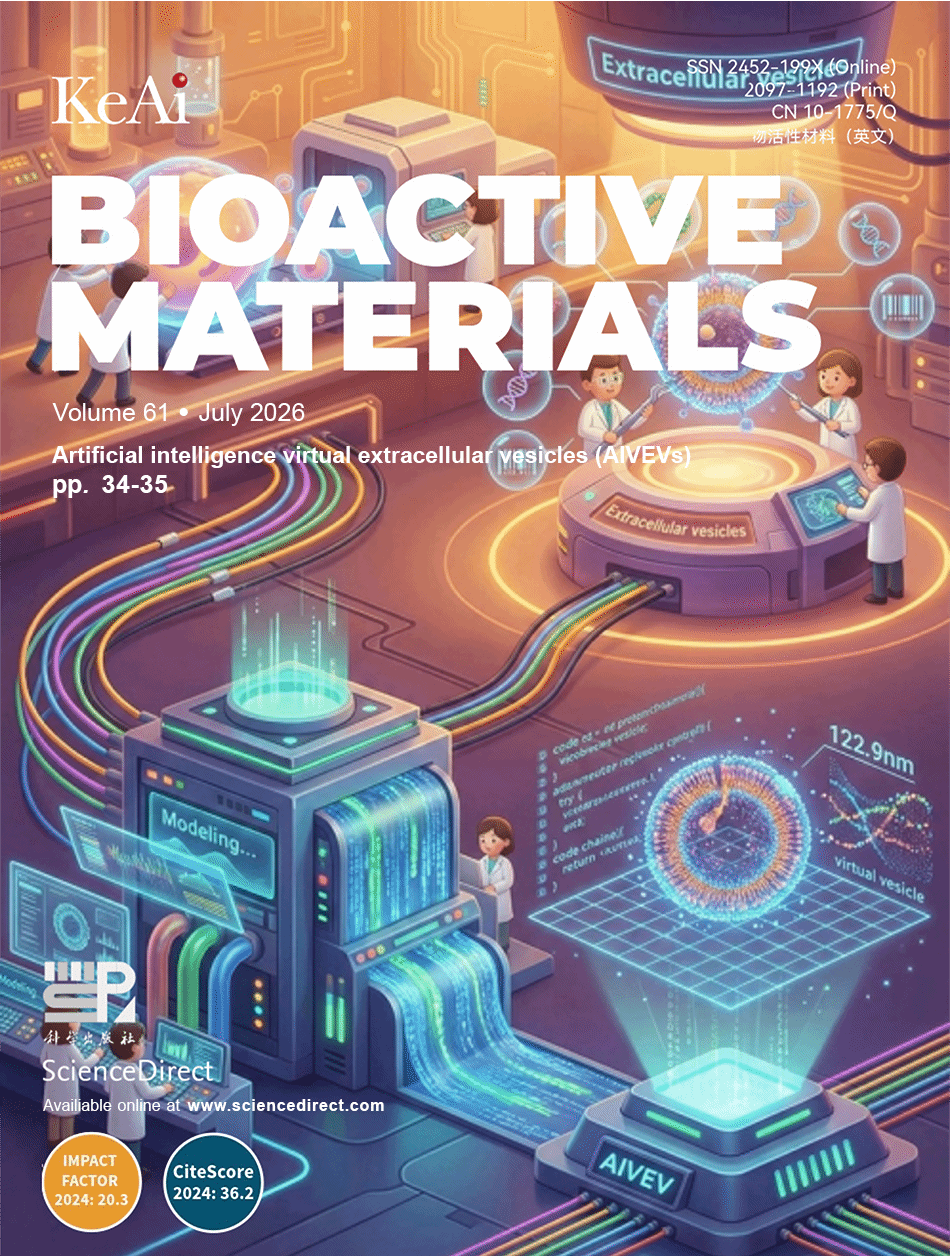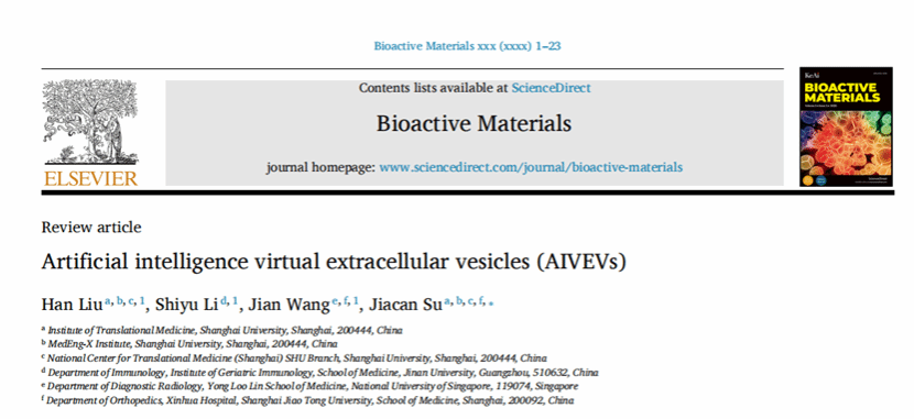 近期,上海大学转化医学研究院苏佳灿教授团队在期刊 Bioactive Materials 上发表综述性文章:"Artificial intelligence virtual extracellular vesicles (AIVEVs)"。首次提出了“人工智能虚拟细胞外囊泡”这一前沿概念,并展望了其在疾病诊断、药物递送、细胞通信研究中的革命性潜力。上海大学转化医学研究院刘晗副研究员、暨南大学基础医学与公共卫生学院利时雨副教授、新加坡国立大学王健博士后为论文共同第一作者,上海大学转化医学研究院苏佳灿教授为论文通讯作者。