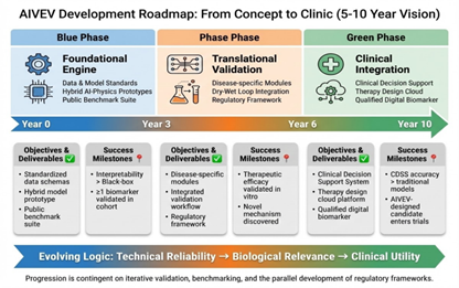 AIVEVs的未来发展已绘制出清晰的战略蓝图。未来三年,它将聚焦于基础引擎的构建,核心任务是建立标准化的数据与模型框架,开发融合AI与生物物理原理的混合模型原型,并构建公开基准测试集,为技术可靠性与可解释性奠定基石。随后三年进入转化验证阶段,重点开发针对肿瘤、神经退行性疾病等特定场景的AIVEVs模块,并打通“干实验预测—湿实验验证”的闭环迭代流程,在验证治疗效能的同时探索全新疾病机制。最后四年将实现临床深度整合,目标是将AIVEVs转化为可直接辅助诊疗的临床决策支持系统、开放共享的治疗设计云平台,并推动基于虚拟模型的数字化生物标志物最终获批,真正实现从“数字孪生”到“临床武器”的跨越。这一由“技术可靠”到“生物相关”再到“临床可用”的演进路径,标志着人工智能正系统性地迈向生命科学的研发核心与临床一线。