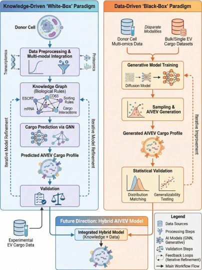 AIVEVs可以通过 “知识驱动的白盒模型” 与 “数据驱动的黑盒模型” 双轨并行,构建可解释、可预测的数字模型,大幅提升研究效率与精准度,两者融合,形成“知识+数据”双驱动的混合智能模型:(1) 白盒模型:基于已知生物学机制(如ESCRT通路),构建可解释的推理模型;(2) 黑盒模型:基于大规模EVs多组学数据,利用生成式AI(如扩散模型)直接生成EVs分子谱。