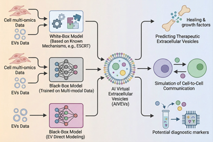 AIVEVs研究的完整闭环: 包括多源数据输入(细胞组学与EVs组学),多种AI建模范式融合(“白盒”+“黑盒”)以及三大应用出口(治疗预测、通信模拟、诊断发现)。