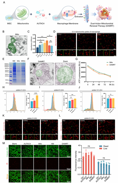 图解: (A) 构建DAMRT的过程示意图,包括MSC来源线粒体的提取、巨噬细胞膜制备和AUTAC4的掺入;(B) 显示提取的完整MSC线粒体的TEM图像,表明其结构完整性;(C) CCK-8检测评估不同线粒体浓度对巨噬细胞增殖的影响;(D) 共聚焦显微镜图像显示不同线粒体浓度下巨噬细胞对线粒体的摄取;(E) 蛋白图谱的SDS-PAGE分析;(F) DAMRT的代表性TEM图像;(G) 在体外不同时间点对Mito和DAMRT组进行ATP活性测量;(H-J) 流式细胞术分析M-Mito-FA、Mito和M-Mito处理不同时间后M1型巨噬细胞的线粒体摄取情况;(K, L) 巨噬细胞在2小时(K)和6小时(L)摄取线粒体的共聚焦显微镜图像;(M) 使用PI和Calcein AM染色评估各种处理后的细胞活力,并对各处理后的活细胞和死细胞进行定量分析。