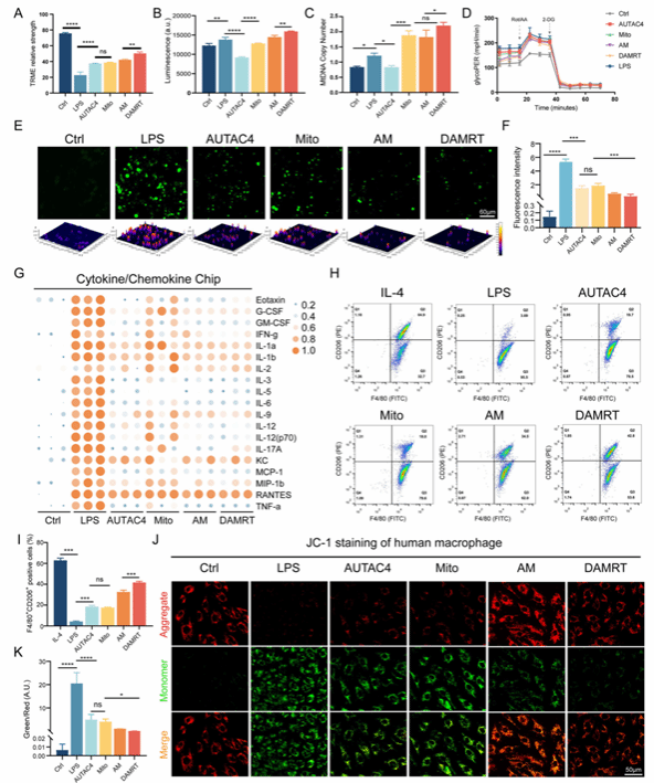 图解:实验使用LPS诱导M1型巨噬细胞极化,随后用各实验组(AUTAC4, Mito, AM, DAMRT)进行处理。(A) 评估线粒体膜电位的流式细胞术分析;(B) 细胞内线粒体ATP生成的分光光度法测量;(C) mtDNA定量为线粒体基因拷贝数的比率;(D) 巨噬细胞用LPS预处理以诱导炎症状态,随后用各实验组再处理,使用Seahorse XF糖酵解速率测定法测量糖酵解速率,并随时间监测glycoPER;(E) 处理后通过DCFDA染色测量细胞内ROS;(F) 使用荧光法对ROS产生强度进行定量分析;(G) 基于Luminex的多重检测显示的所研究细胞因子的浓度;(H) 流式细胞术测量M2型巨噬细胞标志物CD206的表达;(I) 图5H中流式细胞术结果的定量分析;(J) 人骨髓来源的巨噬细胞用LPS处理后,用各组药物干预,使用JC-1测定评估线粒体膜电位,绿/红荧光比率指示线粒体膜去极化的程度;(K) JC-1测定的定量分析。