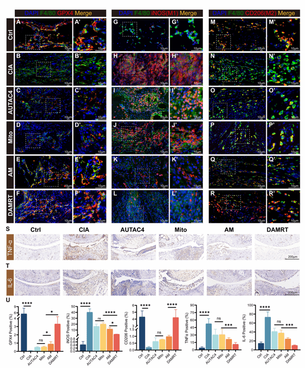 图解:(A-F) 用各种材料处理的踝关节中Gpx4+和F4/80+巨噬细胞的免疫荧光图像,A'-F'是A-F中方框区域的高倍放大图像;(G-L) 用各种材料处理的踝关节中iNOS+和F4/80+巨噬细胞的免疫荧光图像,G'-L'是G-L中方框区域的高倍放大图像;(M-R) 用各种材料处理的踝关节中CD206+和F4/80+巨噬细胞的免疫荧光图像,M'-R'是M-R中方框区域的高倍放大图像;(S-T) 用各种材料处理的踝关节中炎症因子TNF-a (S) 和 IL-6 (T) 的免疫组化图像;(U) 基于免疫荧光和免疫组化结果,定量分析不同样品处理的踝关节组织中Gpx4+、iNOS+、CD206+、TNF-a和IL-6的产生。