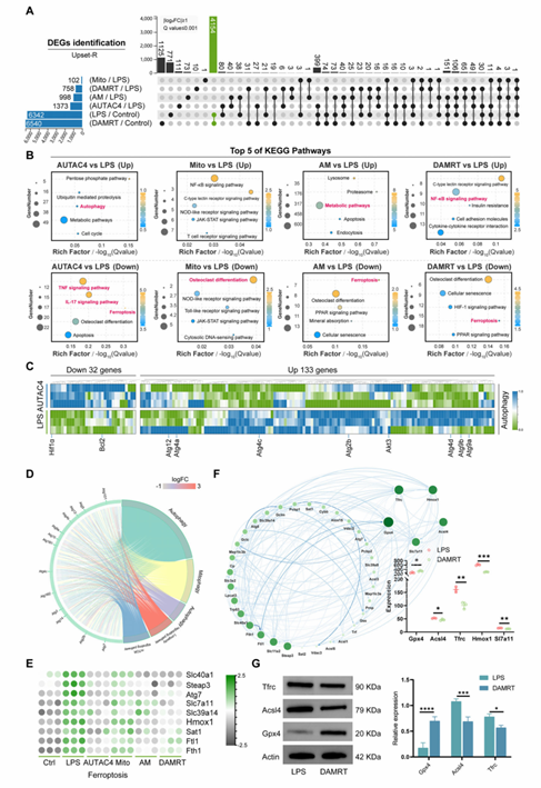 图解:(A) 鉴定DEGs以确定所有可能组合模式下的差异基因集;(B) AUTAC4 vs LPS、Mito vs LPS、AM vs LPS和DAMRT vs LPS的前5个通路富集分析;(C) AUTAC4 vs LPS差异表达的自噬相关基因的热图;(D) 差异表达的自噬相关基因的KEGG富集分析的圆形可视化图;(E) 差异表达的铁死亡相关基因的热图,颜色标尺表示铁死亡相关基因表达值逐渐增加;(F) DAMRT vs LPS的蛋白相互作用分析,右侧集合显示每次比较中关键介质的详细表达谱;(G) LPS和DAMRT组中铁死亡相关蛋白(Gpx4, Acsl4和Tfrc)的Western blot分析。