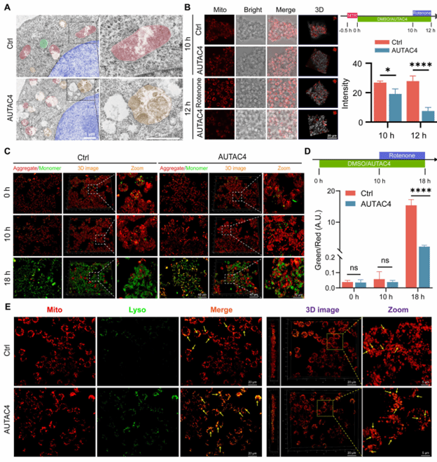 图解:(A) 线粒体自噬的代表性透射电镜(TEM)图像,对照组接受鱼藤酮以诱导线粒体损伤,AUTAC4组接受相同的鱼藤酮处理随后进行AUTAC4处理,图中绿色代表线粒体,红色代表功能障碍线粒体,黄色代表线粒体自噬;(B) 用MTR标记线粒体后,用AUTAC4处理巨噬细胞,并在处理后期用鱼藤酮诱导线粒体损伤,通过共聚焦显微镜评估线粒体动力学;(C) JC-1染色测定显示AUTAC4恢复鱼藤酮诱导的巨噬细胞的线粒体膜电位,实验中在AUTAC4处理开始后加入鱼藤酮以诱导功能障碍;(D) JC-1染色的统计定量分析;(E) 线粒体和溶酶体的共定位观察。