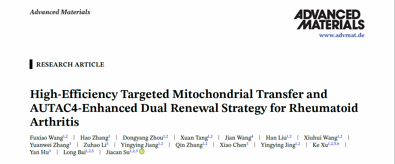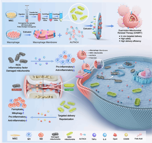 近期,上海大学转化医学研究院苏佳灿教授团队在期刊 Advanced Materials 上发表研究性文章:"High-Efficiency Targeted Mitochondrial Transfer and AUTAC4-Enhanced Dual Renewal Strategy for Rheumatoid Arthritis"。本研究针对类风湿关节炎(RA)治疗中常规生物材料靶向性差及无法逆转线粒体损伤的瓶颈,开发一种名为“双重作用线粒体更新疗法”(DAMRT)的仿生递送系统。该系统利用叶酸修饰的巨噬细胞膜伪装,实现对病灶部位活化M1型巨噬细胞的精准靶向,并通过负载自噬靶向嵌合体(AUTAC4)特异性清除受损线粒体,同时引入健康的间充质干细胞(MSC)线粒体以恢复能量代谢,从而通过抑制铁死亡途径有效促使促炎M1巨噬细胞向抗炎M2表型重编程。在体内实验中,DAMRT显著减轻关节炎小鼠的滑膜炎症、软骨降解及骨质破坏,且具备良好的生物安全性。展望未来,该策略不仅确立利用“活体材料”恢复细胞稳态的通用治疗平台,有望扩展至其他线粒体功能障碍疾病及骨类器官的能量供应模块,后续研究若结合微流控技术优化制备工艺,将进一步推动其在再生医学领域的标准化与临床转化。上海大学转化医学研究院汪拂晓博士后、上海交通大学医学院附属新华医院张浩主治医师、上海大学转化医学研究院周东阳博士后、唐璇博士研究生为论文共同第一作者,上海大学转化医学研究院苏佳灿教授、白龙副研究员、上海交通大学医学院附属新华医院胡衍主治医师、上海大学转化医学研究院徐可研究员为论文共同通讯作者。