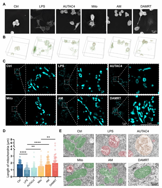 图解: (A) 处理后24小时不同组别的代表性Nanolive图像,展示细胞结构;(B) Nanolive的3D透视图,其中细胞膜显示为绿色,线粒体显示为橙色;(C) 记录标记有PKMDR的线粒体嵴的代表性HIS-SIM图像;(D) HIS-SIM结果的定量分析;(E) 线粒体和线粒体自噬的代表性TEM图像,其中绿色代表线粒体,红色代表功能障碍线粒体,黄色代表线粒体自噬 。