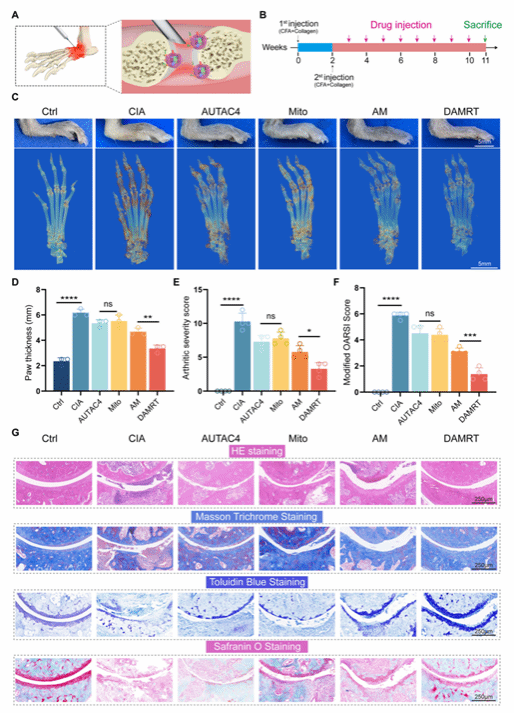 图解:(A) DAMRT的注射策略;(B) CIA模型建立方案;(C) CIA小鼠模型的爪子代表性图像及后爪Micro-CT成像,对照组接受PBS注射,骨赘定义为超出原始皮质骨轮廓的矿化突起,在3D重建图像中通过不同颜色(橙色)识别;(D) 第一次注射后第11周的爪厚度评估;(E) 第一次注射后第11周的爪肿胀评分评估;(F) 显微镜观察软骨的改良OARSI评分;(G) 小鼠踝关节的H&E染色、Masson三色染色、甲苯胺蓝染色和番红-O染色 。