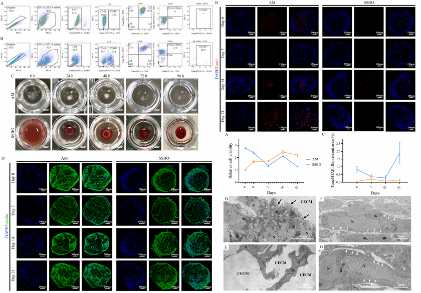尤为重要的是,SSBO 在无额外血管诱导条件下,自发形成结构清晰的血管样网络。SVF 中的内皮祖细胞沿 CECM 排列形成管腔样结构,周细胞呈伴行分布,构建出稳定的类血管系统。与此同时,巨噬细胞在类器官形成早期短暂激活炎症反应,随后快速向 IL-10 主导的抗炎表型转变,维持有利于组织重建的免疫微环境,揭示免疫调控在类器官自组织与稳定中的关键作用。