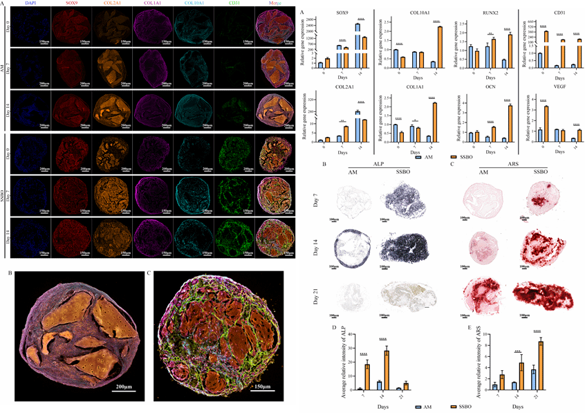 在体外培养过程中,SSBO 展现出显著优于单一 ADSC 构建体系的生物学特性。多细胞协同作用促进细胞向基质内部主动迁移,并伴随显著的基质降解与再沉积,形成高度整合的三维结构。超微结构与分子分析显示,SSBO 内部发生类似软骨内成骨的连续分化过程:早期表达 SOX9 与 COL2A1,随后依次上调 RUNX2、COL1A1 与 OCN,提示其在时间和空间上高度模拟生理性软骨向骨转变路径。