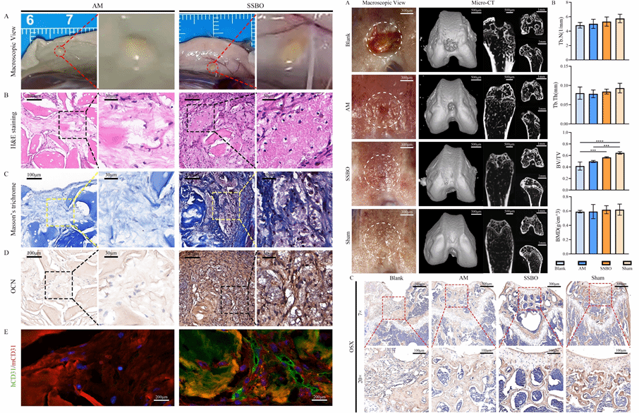 在体内实验中,SSBO 表现出优异的血管整合与成骨能力。皮下移植后,类器官可与宿主血管系统形成嵌合血管网络,并生成结构有序的骨样组织。在小鼠骨软骨缺损模型中,SSBO 显著促进软骨下骨重建与上覆软骨再生,在骨体积、骨小梁结构及组织学评分等多项指标上均优于对照组,修复效果接近正常关节组织。