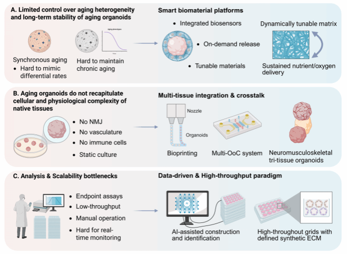 图3. 衰老类器官培养的现存局限与挑战应对策略。 (A) 对异质性和长期稳定性的控制有限(左),但可通过采用具有可调特性、集成生物传感器和按需释放系统的智能生物材料来改进(右)。(B) 细胞和生理复杂性不足(左),可通过多组织整合、多器官/神经肌肉骨骼系统的生物打印以及促进组织间通讯来克服(右)。(C) 分析和规模化瓶颈(左),例如低通量和实时监测有限,可通过数据驱动方法、AI辅助构建与识别以及采用合成ECM网格的高通量平台来解决(右)。