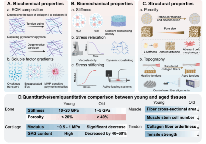 图2. 衰老微环境的关键材料参数调控。 (A) 生化性质调控。(B) 生物力学性质调控。(C) 结构性质调控。(D) 年轻与衰老组织材料性质的定量/半定量比较。