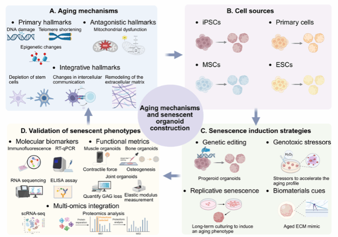 图1. 衰老机制与衰老类器官构建策略。 (A) 肌肉骨骼组织的核心衰老机制。(B) 用于构建衰老类器官的细胞来源。(C) 衰老诱导策略。(D) 衰老表型的验证。